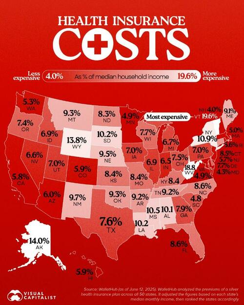 This map, via Visual Capitalist’s Bruno Venditti, shows which states pay the most (and least) when health insurance costs are measured as a share of median income.