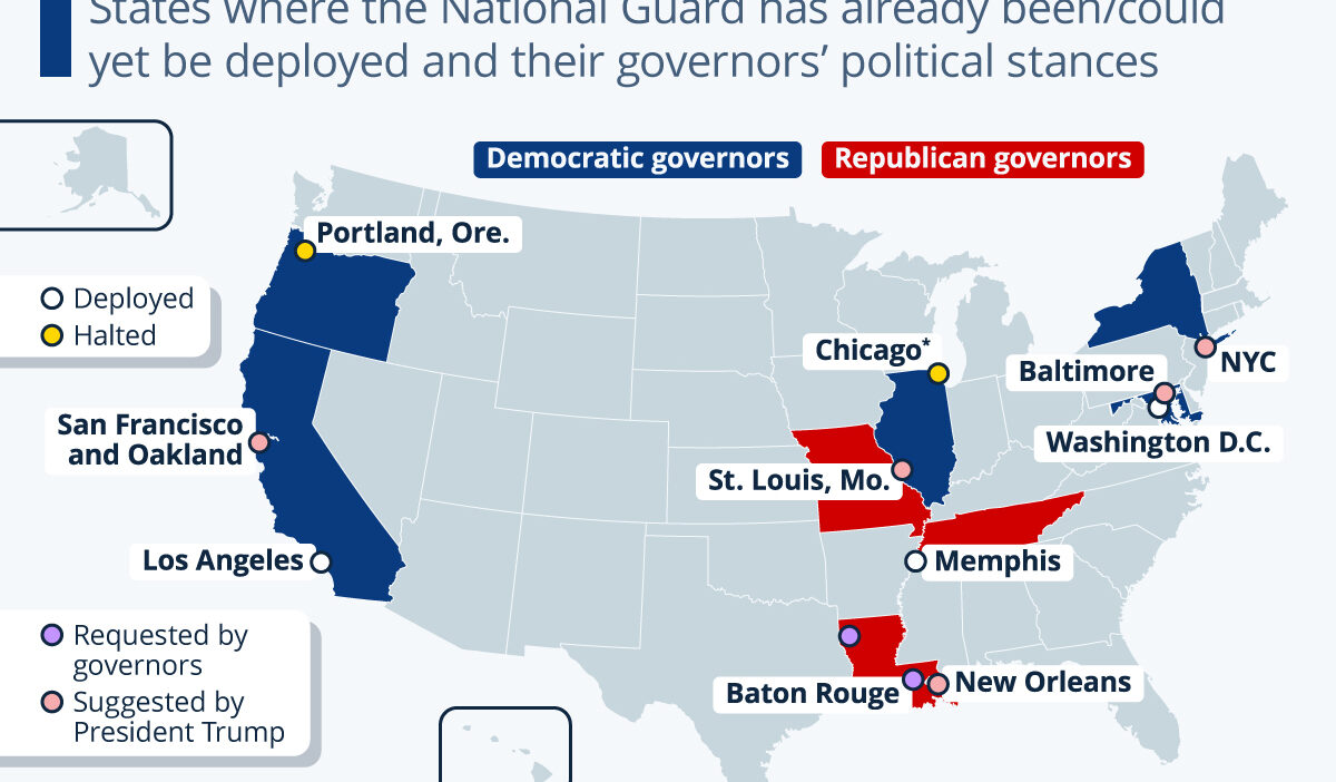 While troops were briefly deployed in Chicago, they were blocked from activation by a judge on October 9. Similarly, court rulings have stopped the rollout of Oregon’s own National Guard members to Portland, as well as the deployment of National Guard troops from California to Portland.