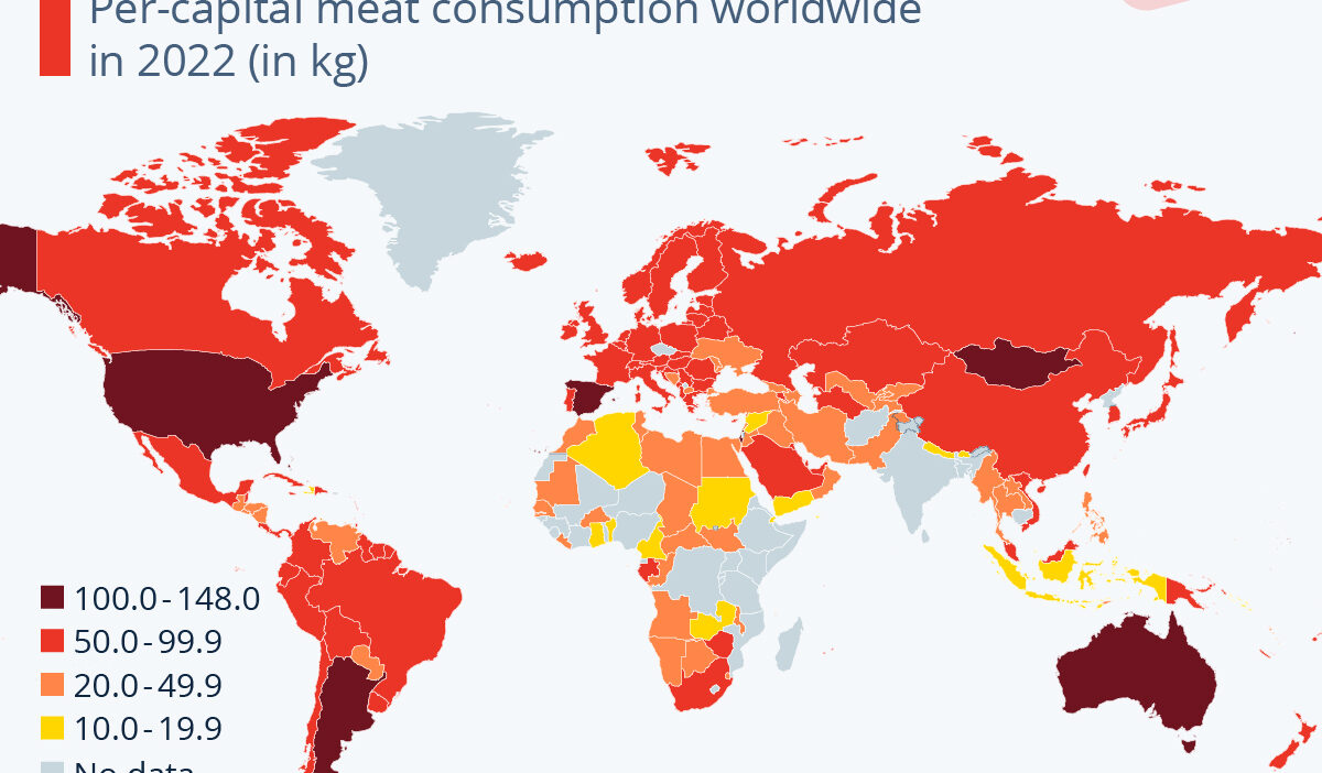 As Statista’s Katharina Buchholz details below, according to UN Food and Agriculture Organization data reported by website World Population Review, the United States, Argentina and Australia are in the top of the global meat-eating league with more than 110 kg consumed per capita in 2022.