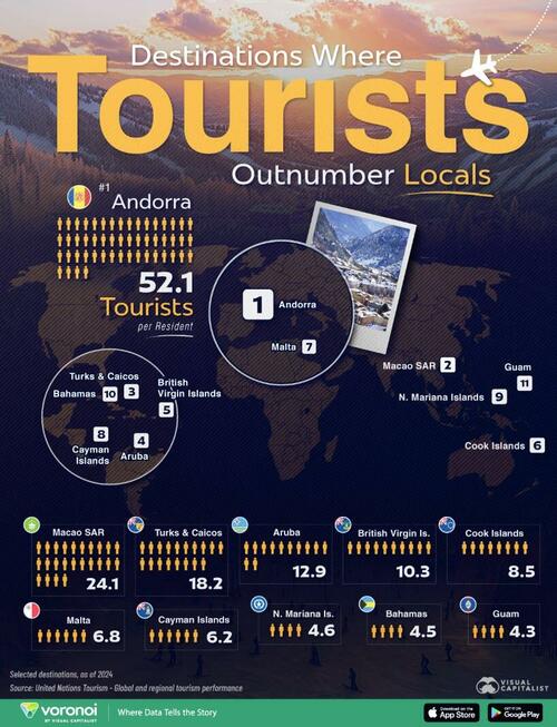 Worth noting that the map, via Visual Capitalist’s Bruno Venditti, excludes the Vatican, the world’s smallest sovereign nation, which has around 800 residents but can receive over 6 million visitors per year—equivalent to roughly 7,500 tourists per resident.