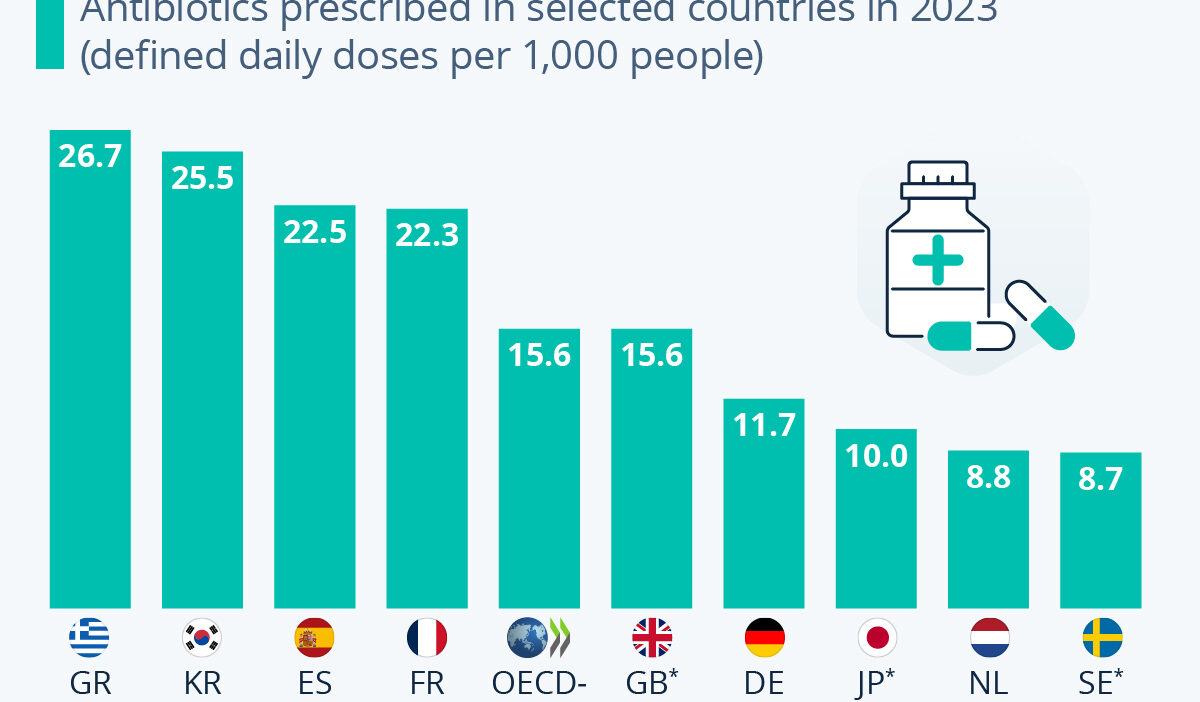 As Statista’s Anna Fleck details below, a recent report by the OECD highlights significant disparities in antibiotic prescribing practices across countries.