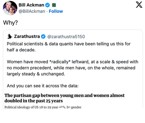 Bill Ackman quote-tweeted a graph showing the partisan gap between young men and women almost doubled in 25 years.